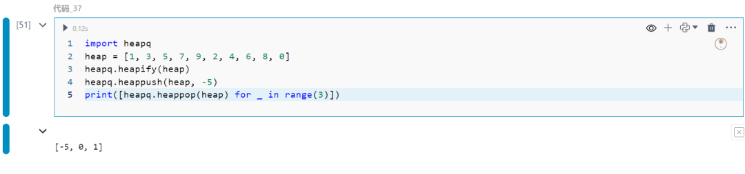 import heapqheap = [1, 3, 5, 7, 9, 2, 4, 6, 8, 0]heapq.heapify(heap)heapq.heappush(heap, -5)print([heapq.heappop(heap) for _ in range(3)])