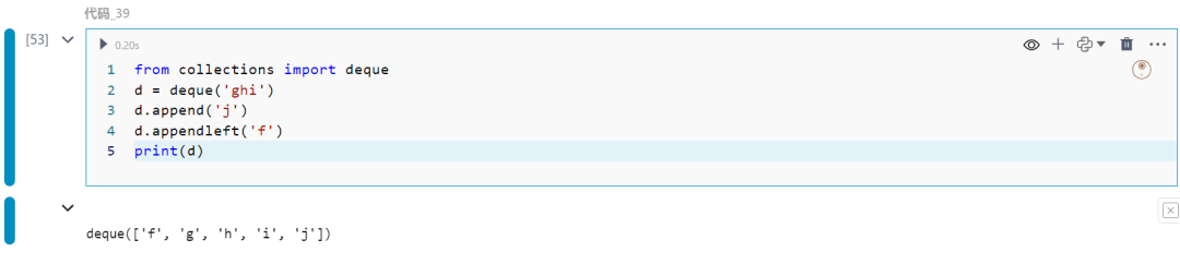 from collections import dequed = deque('ghi')d.append('j')d.appendleft('f')print(d)