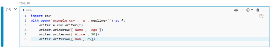 import csvwith open('example.csv', 'w', newline='') as f: writer = csv.writer(f) writer.writerow(['Name', 'Age']) writer.writerow(['Alice', 30]) writer.writerow(['Bob', 25])