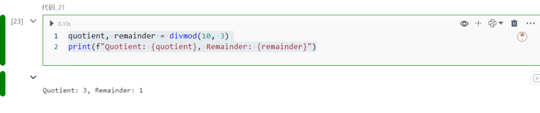 quotient, remainder = divmod(10, 3)print(f"Quotient: {quotient}, Remainder: {remainder}")