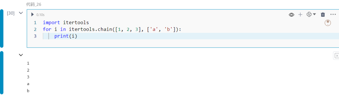 import itertoolsfor i in itertools.chain([1, 2, 3], ['a', 'b']): print(i)