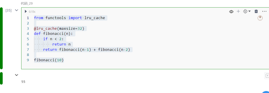 @lru_cache(maxsize=32)def fibonacci(n): if n < 2: return n return fibonacci(n-1) + fibonacci(n-2)