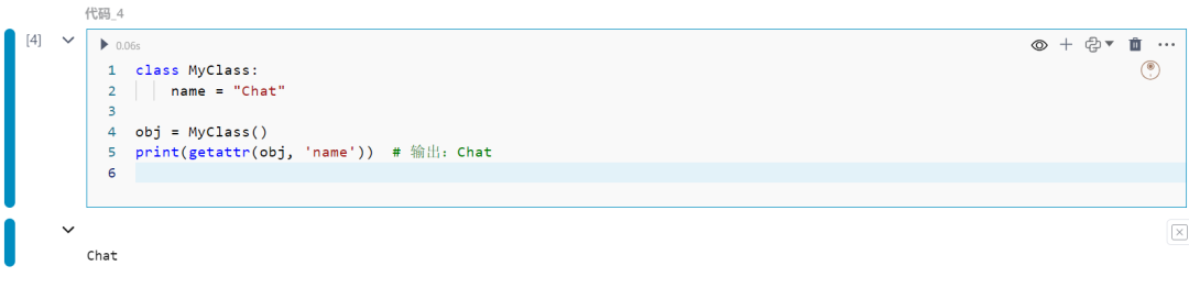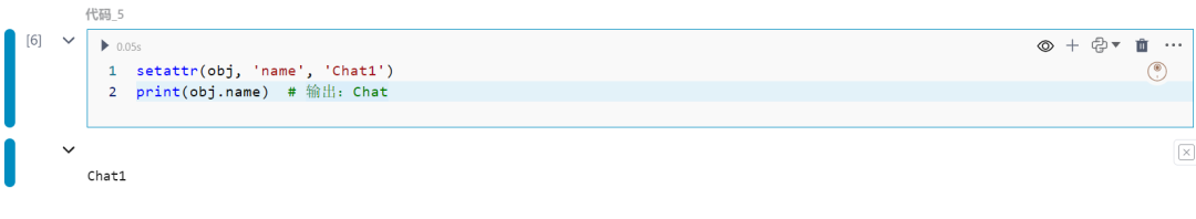 setattr(obj, 'name', 'Chat1')print(obj.name)