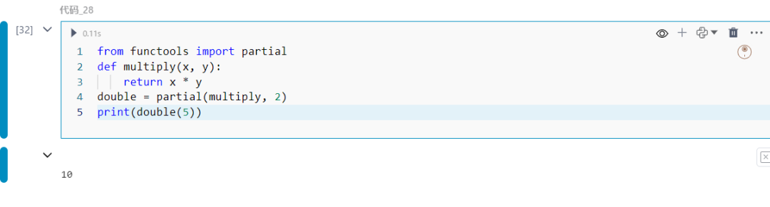 from functools import partialdef multiply(x, y): return x * ydouble = partial(multiply, 2)print(double(5))
