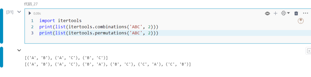 import itertoolsprint(list(itertools.combinations('ABC', 2)))print(list(itertools.permutations('ABC', 2)))