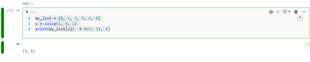 my_list = [0, 1, 2, 3, 4, 5]s = slice(1, 5, 2)print(my_list[s])