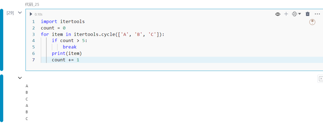 import itertoolscount = 0for item in itertools.cycle(['A', 'B', 'C']): if count > 5: break print(item) count += 1