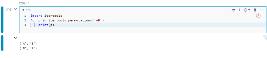 import itertoolsfor p in itertools.permutations('AB'): print(p)