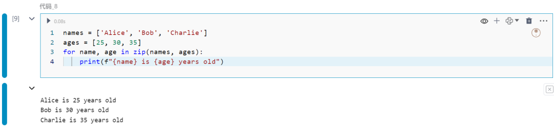 names = ['Alice', 'Bob', 'Charlie']ages = [25, 30, 35]for name, age in zip(names, ages): print(f"{name} is {age} years old")