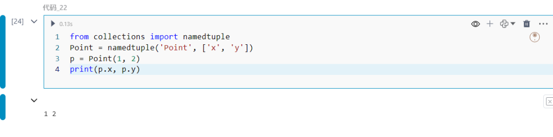 from collections import namedtuplePoint = namedtuple('Point', ['x', 'y'])p = Point(1, 2)print(p.x, p.y)