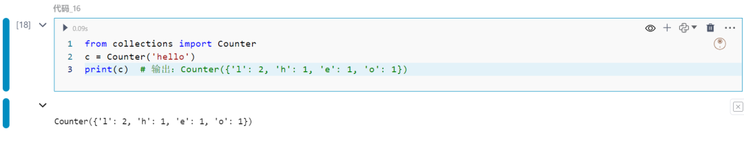 from collections import Counterc = Counter('hello')print(c) # 输出:Counter({'l': 2, 'h': 1, 'e': 1, 'o': 1})