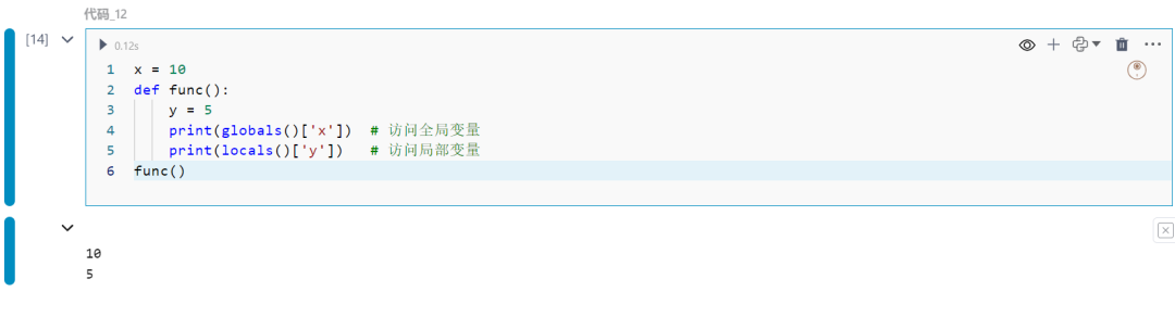 x = 10def func(): y = 5 print(globals()['x']) print(locals()['y']) func()