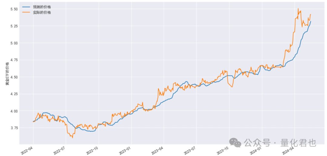 上一步模型训练好了,那咱就可以预测黄金ETF的价格了,直接调用LinearRegression对象当中的predict函数就可以预测了(sklearn库当中的模型都可以这样操作)。