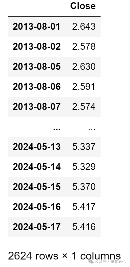 Df = etf_data[['收盘']].rename(columns={'收盘':'Close'})