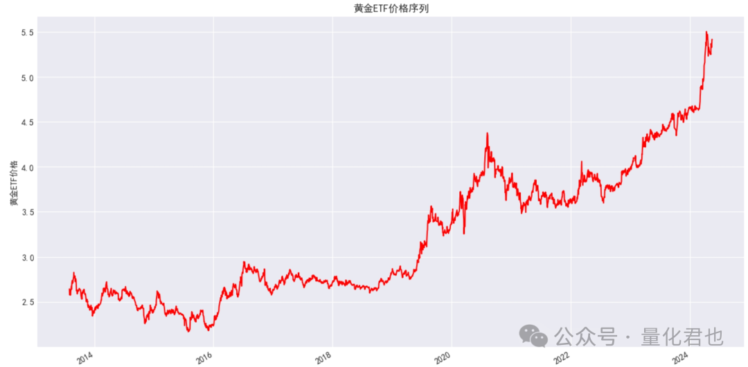 上面的代码是用akshare来获取黄金ETF的行情数据,只需要其中的收盘价序列,数据的形式是一个DataFrame,index为datetime格式的日期(与yfinance一致),columns只有一个收盘价(Close)字段,并画出黄金ETF收盘价序列。