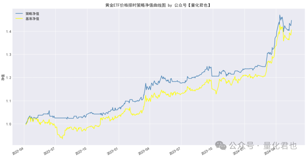 title='黄金ETF价格择时策略净值曲线图 by 公众号【量化君也】')