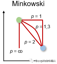 闵可夫斯基距离是上述距离度量的广义形式。它可以用于相同的用例,同时提供高灵活性。我们可以选择 p 值来找到最合适的距离度量。