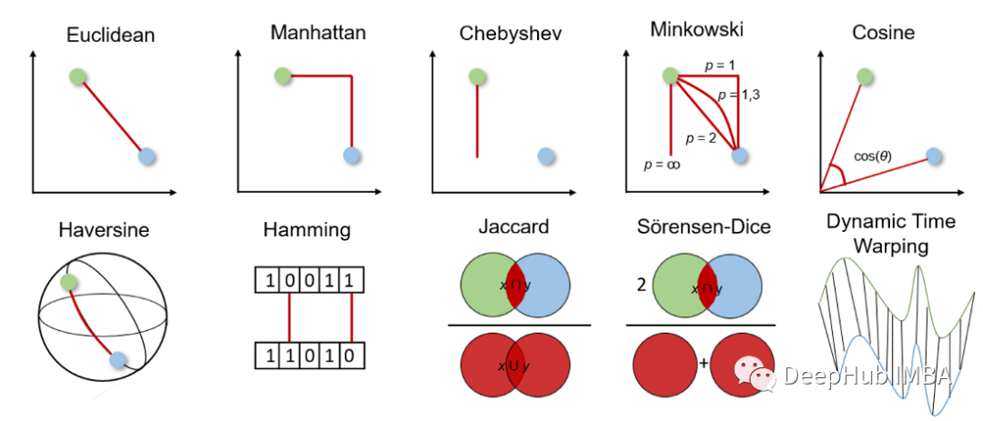 对于距离的度量,我们可以在几何距离测量和统计距离测量之间进行选择,应该选择哪种距离度量取决于数据的类型。特征可能有不同的数据类型(例如,真实值、布尔值、分类值),数据可能是多维的或由地理空间数据组成。