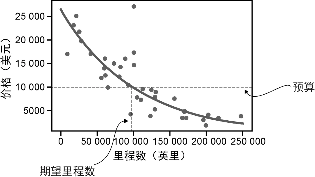 次幂。将这些数值代入方程,我们发现,如果预算是10 000美元,那么应该购买一辆行驶里程约为97 000英里的普锐斯(见图1-6)。如果曲线表示的是合理的价格,那么低于该线的汽车通常应该是划算的。