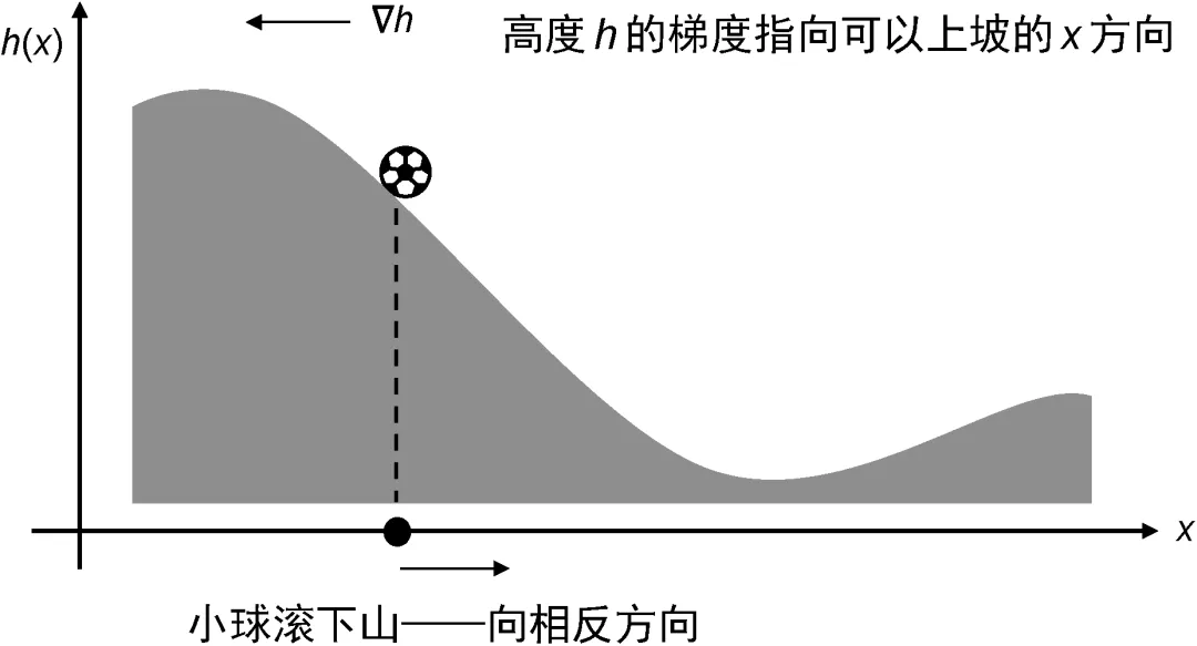 给出,则梯度指向上坡的方向,而球的滚动方向正好相反(见图 1-13)。