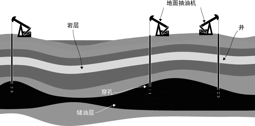 为了解释软件的工作原理,这里介绍一些石油术语。将称为井的钻孔钻到地下,直到到达含有石油的多孔(海绵状)岩石。这层富含石油的岩石称为储油层。石油被抽到地面并卖给炼油厂,然后炼油厂将石油转化为我们日常使用的产品。图1-11为油田示意图(未按比例显示)。