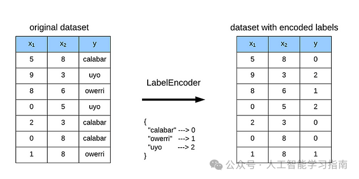 上述两种编码器通常用于解释变量(x),对于预测变量(y),我们应该使用标签编码(Label Encoding),即LabelEncoder(),标签编码是专门为输出变量设计的。