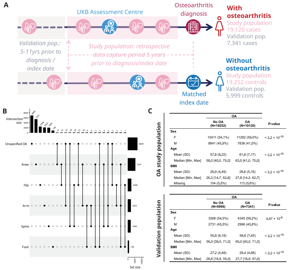 英国生物样本库队列的 ~45% 的初级医疗保健数据可用,这使得被诊断患有 OA 的患者子集 (N = 67,772) 的纵向数据成为可能。确定了在可用的 EHR 研究期间从未被诊断患有 OA 的相同数量的对照参与者 (N = 67,772)。