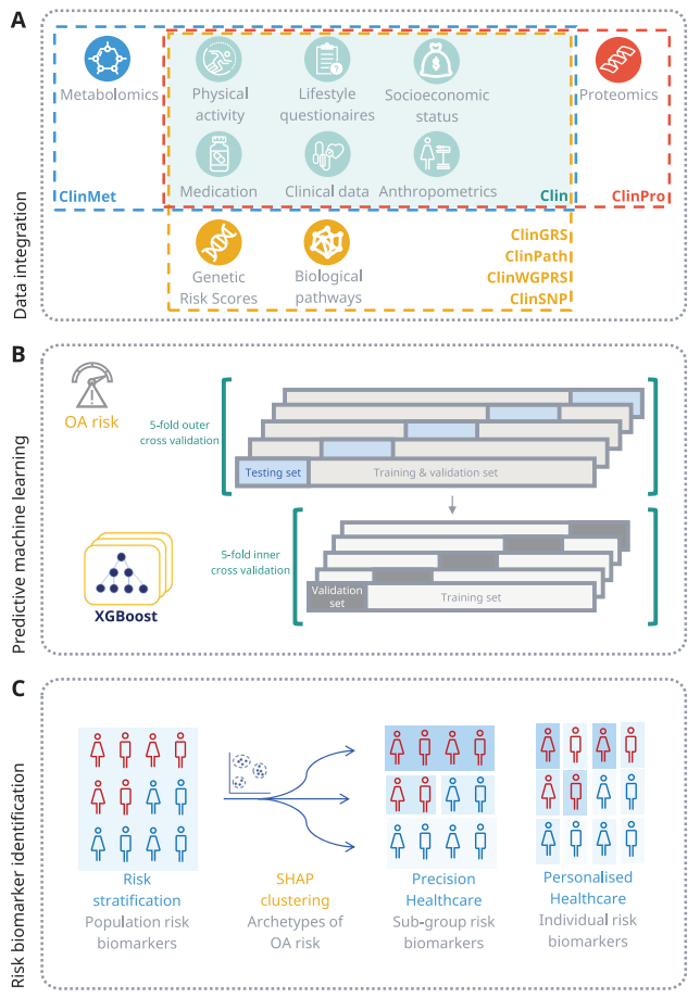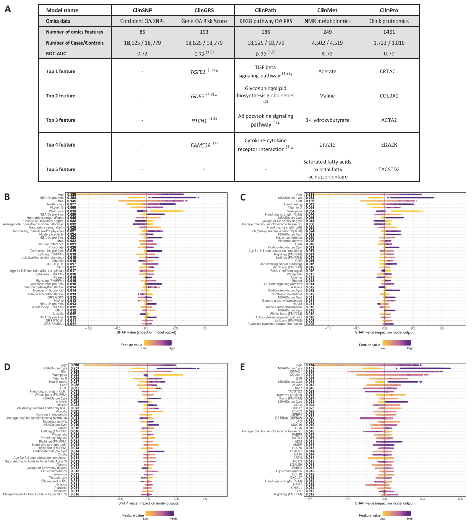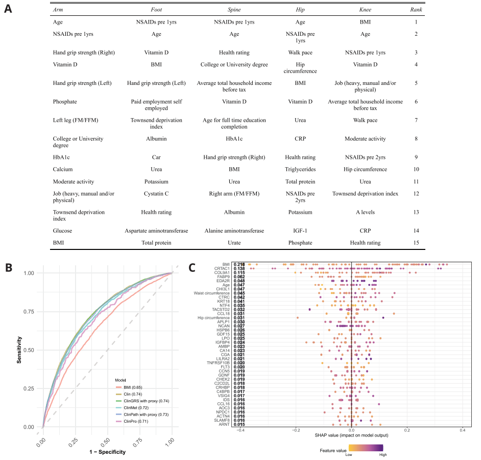为了在临床预测模型(Clin模型)的背景下探索OA的分子风险生物标志物,我们将各种类型的组学数据与临床特征相结合,包括OA遗传学(ClinSNP、ClinWGPRS、ClinGRS和ClinPath模型)、代谢组学(ClinMet模型)和蛋白质组学数据(ClinPro模型),用于有这些数据的个体子集。