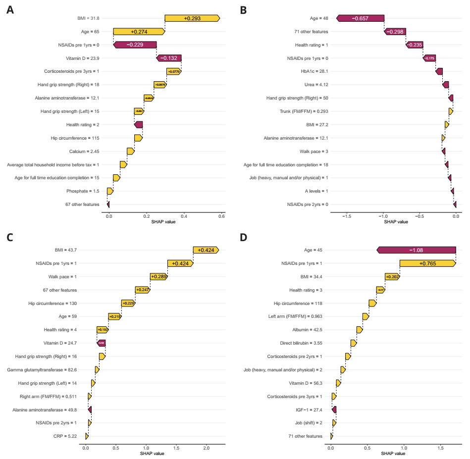 使用 Clin 模型的 SHAP 值进行解释,可以量化个体患者数据对其预测的 OA 诊断风险的影响。我们使用瀑布图提取并可视化了个体 OA 风险概况,展示了个人 OA 风险生物标志物预测的积极和负面影响。