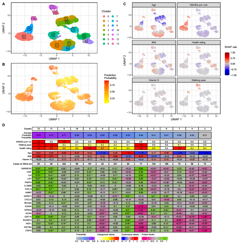 Clin 模型证实,OA 背后的生物学和环境危险因素在个体之间是异质的。我们试图捕捉这种异质性,并将患者分为具有不同风险生物标志物特征的亚组。因此,我们对所有个体中所有风险生物标志物的 SHAP 值进行了聚类,如 Clin 模型估计的那样。根据轮廓分数和预测指标对聚类分辨率进行了优化,识别出 14 个个体簇。