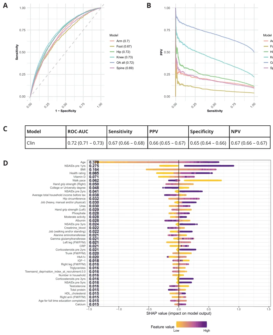 为了进一步探索风险生物标志物在诊断为 OA 的不同关节中的影响,我们对被诊断患有 OA 的个体亚群重新训练了我们的 Clin 模型,这些个体在从临床 OA 诊断中确定的五个关节中的任何一个关节中。