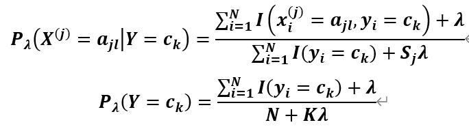 的最后概率为0,而这个错误的造成是由于训练量不足,会令分类器泛化能力大大降低,为了解决这个问题加入拉普拉斯平滑,它的思想非常简单,就是对每个类别下所有划分的计数加1,公式为: