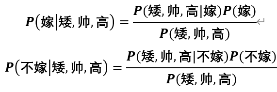 已有历史数据,现来了一个男士新的特征(矮,帅,高),来进行预测嫁与不嫁,根据贝叶斯公式我们可以得到以下两个公式,比较两个值的大小就可以预测出嫁与不嫁,不难看出我们只需要比较分子的大小就可以。