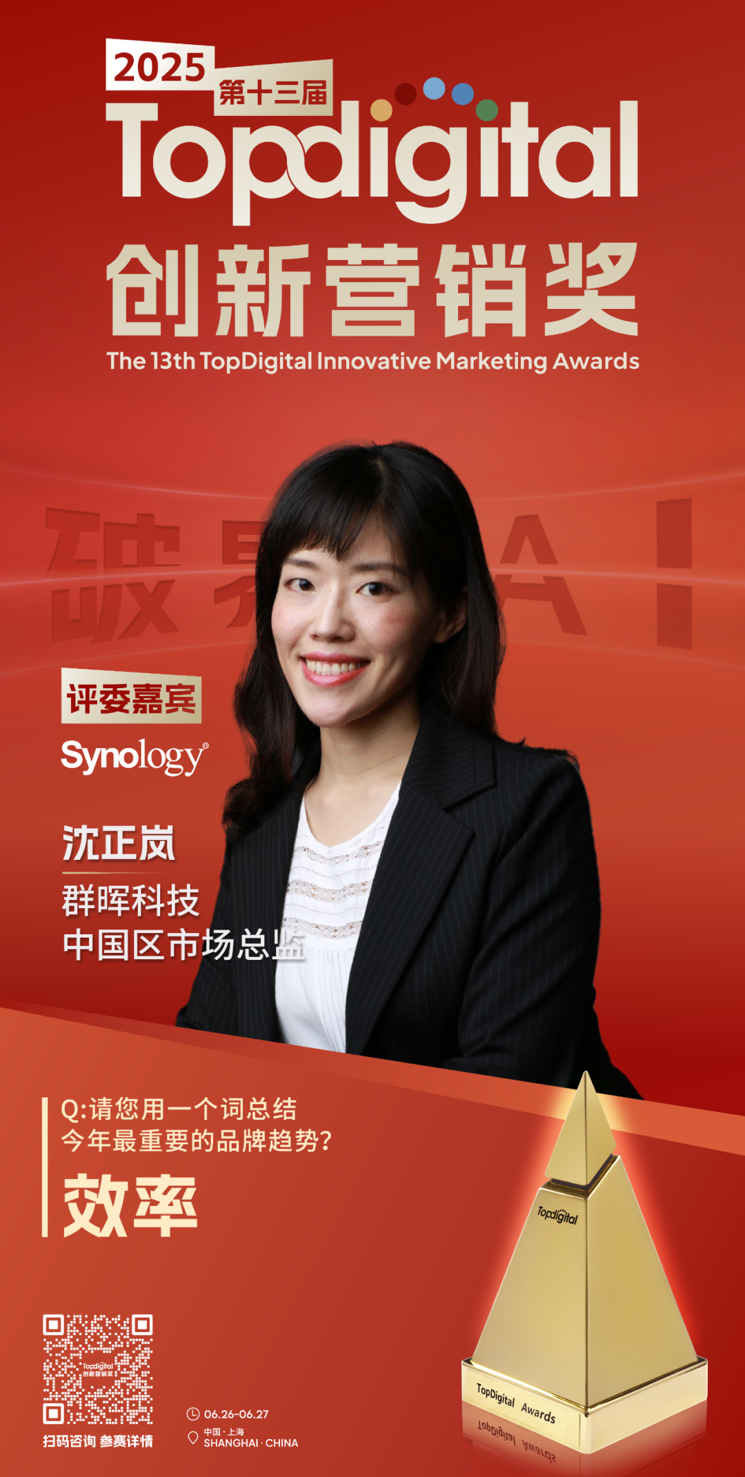 当生成式AI在1秒内完成人类72小时的创意产出,当智能算法精准预判用户下一秒的消费冲动,我们正站在营销革命的临界点。全球数字营销市场以23.6%的年复合增长率狂奔,AI技术的渗透率却在短短18个月内从实验性应用跃升为行业基建——这不是技术迭代,而是认知维度的颠覆性跃迁。2025年将成为AI发展的关键之年,在此背景下,2025第十三届TopDigital创新营销盛典以“破界· AI”为年度主题应势而生,一场解构商业本质的双向革命开启了!此次TopDigital非常荣幸邀请到群晖科技中国区市场总监沈正岚加入专家评审团,与我们共同见证品牌典范、杰出产品、精彩案例以及优秀服务机构的诞生。