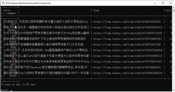 可以看到,taob表中有四个字段。其中title字段用于存储淘宝商品的名称;link字段存储淘宝商品的链接;price存储淘宝商品的价格;comment存储淘宝商品的评论数(一定程度上代表商品的销量)。
