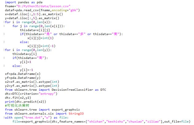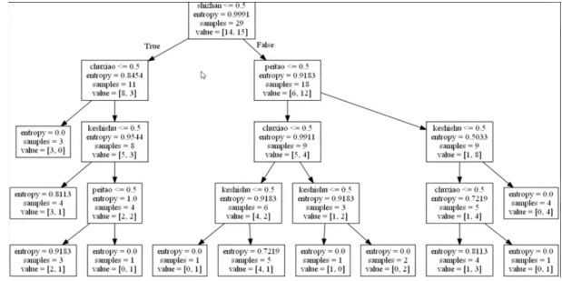 决策树算法实现过程为:首先取出数据的类别,然后对数据转化描述的方式(例如将“是”转化成1,“否”转化成0),借助于sklearn中的DecisionTreeClassifier建立决策树,使用fit()方法进行数据训练,训练完成后直接使用predict()即可得到预测结果,最后使用export_graphviz进行决策树的可视化。具体实现过程如下图所示: