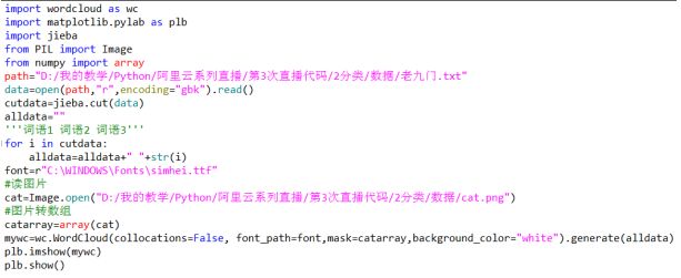 实现的大致流程是:先使用cut()对文档进行切词,在切词完成之后,将这些词语整理为固定格式,然后根据所需的词云图的展现形式读取相应的图片(下图中的词云图是猫的形状),接着使用wc.WordCloud()进行词云图的转换,最后通过imshow()展现出相应的词云图。例如根据老九门.txt文档绘制的词云图效果如下图所示: