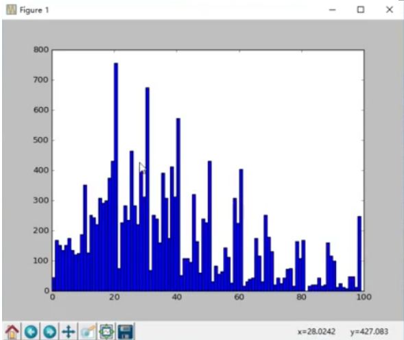 其中,借助arrange()方法来制定样式,arrange()方法第一个参数代表最小值,第二个参数代表最大值,第三个参数代表组距,接下来使用hist()方法来绘制直方图。