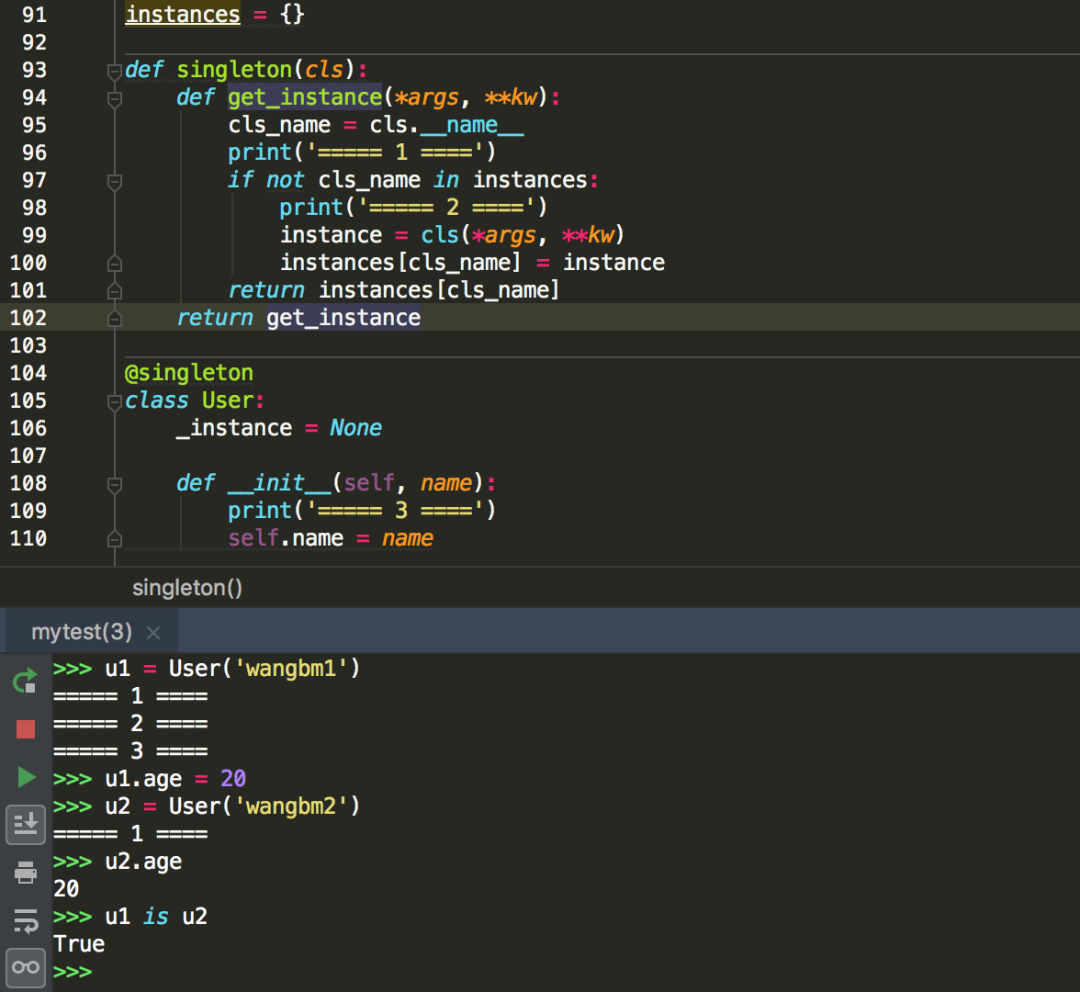 get_instance (*args, **kw) : cls_name = cls.__name__ print('===== 1 ====' ) if not cls_name in instances: print('===== 2 ====' ) instance = cls(*args, **kw) instances[cls_name] = instance return instances[cls_name] return get_instance@singleton class User : _instance = None def __init__ (self, name) : print('===== 3 ====' ) self.name = name可以看到我们用singleton 这个装饰函数来装饰 User 这个类。装饰器用在类上,并不是很常见,但只要熟悉装饰器的实现过程,就不难以实现对类的装饰。在上面这个例子中,装饰器就只是实现对类实例的生成的控制而已。