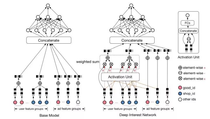 DIN 把用户特征、用户历史行为特征进行 embedding 操作,视为对用户兴趣的表示,之后通过 attention network,对每个兴趣表示赋予不同的权值。