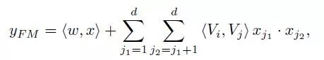 FM 模型可以看成是线性部分的 LR,还有非线性的特征组合 xixj 交叉而成,表示如下: