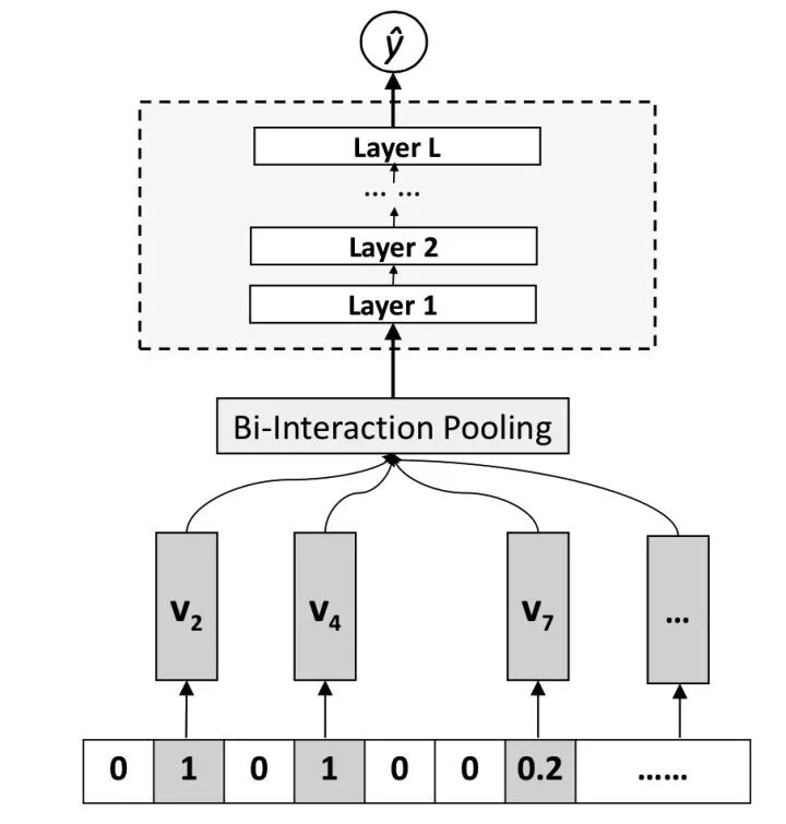 Neural Factorization Machines,简称 NFM,提出了一种更加简单粗暴的方法,在 embedding 层后,做了一个叫做 BI-interaction 的操作,让各个 field 做 element-wise 后 sum 起来去做特征交叉,MLP 的输入规模直接压缩到 k 维,和特征的原始维度 n 和特征 field 维度 f 没有任何关系。