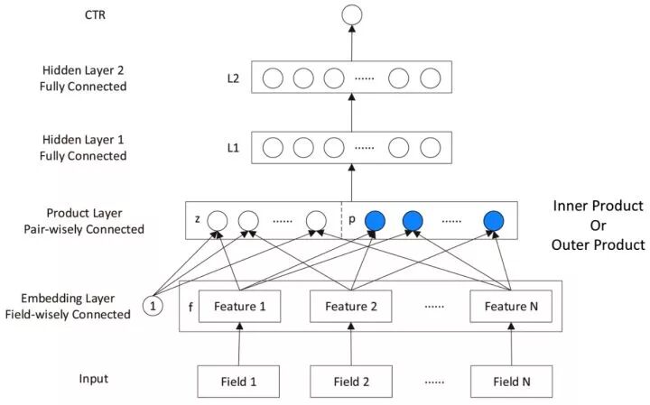 PNN,全称为 Product-based Neural Network,认为在 embedding 输入到 MLP 之后学习的交叉特征表达并不充分,提出了一种 product layer 的思想,既基于乘法的运算来体现体征交叉的 DNN 网络结构,如图 4 所示。