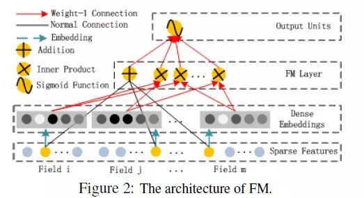 图 1 是从神经网络的角度表示 FM, 可以看成底层为特征维度为 n 的离散输入,经过 embedding 层后,对 embedding 层线性部分(LR)和非线性部分(特征交叉部分)累加后输出。