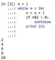 在这个例子中,我们可以发现当n除以2的余数大于0,即n为奇数时,就跳过本次循环接下来的代码,直接进入下一次循环,因而所有打印出的都是偶数,即我们可以得到偶数2,4,6,8,10。