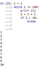 在这个例子中,我们会发现前四行程序原本应该打印出数字1-100,但是由于在循环中加入了break,使得到数字10时,循环终止。