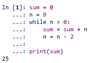 我们可以发现,在循环的过程中,print输出的是25,且n的值是递减的,从9开始到-1时,不再满足条件,循环退出。