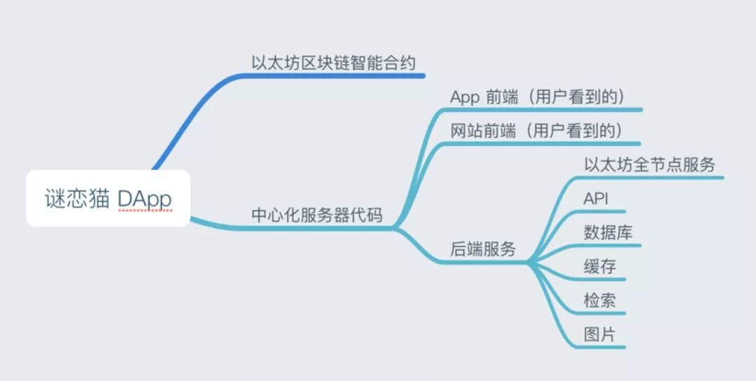 谜恋猫是一个 DApp(Decentralized Application),部分程序部署在区块链上,部分程序部署在中心化的服务器上,总体架构如下图: