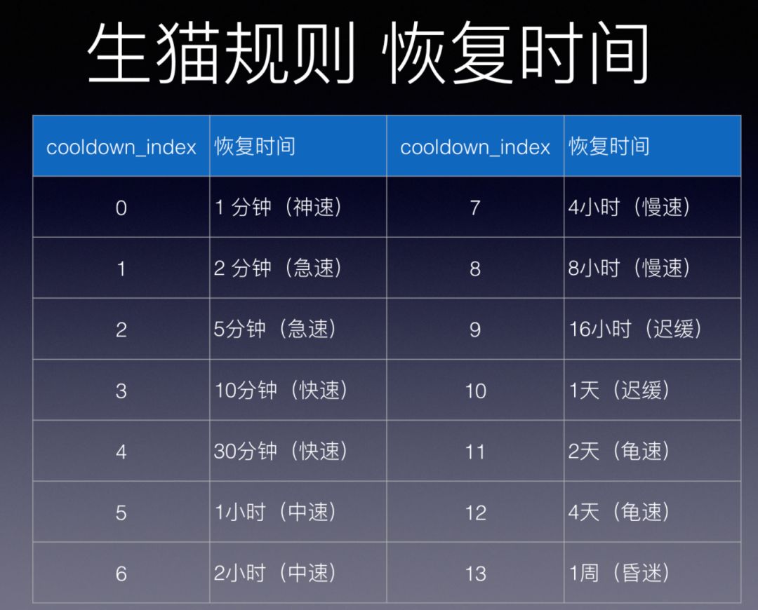 小猫恢复时间 cooldown_index = min( 小猫代数 / 2 ,13);