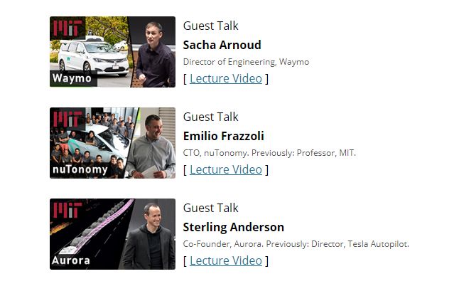 客座讲师阵容相当有料,有Waymo技术总监、nuTonomy 首席技术官和前特斯拉Autopilot主管,够你把自动驾驶界的鼻祖都摸个透了。